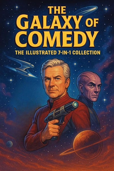 This 7-in-1 illustrated collection is packed with hilarious sci-fi adventures, featuring stunning artwork and photos that bring the galaxy’s quirkiest characters, oddest planets, and most ridiculous moments to life. With 90,000 words of cosmic chaos, this 530+ page masterpiece blends clean humor, space opera thrills, and stand-up-worthy jokes into an unforgettable experience.