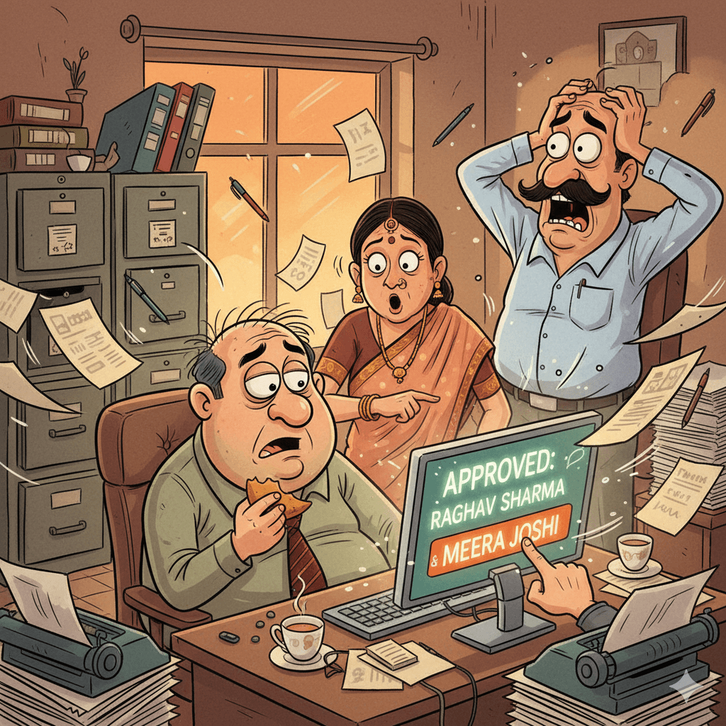 Raghav immediately regretted using the new system for Meera’s application. He closed his eyes, cursed himself, clicked Upload, and dragged Meera’s scanned form onto the screen. Then, as per procedure, he selected his own name from the dropdown to log the entry. He should’ve selected “Registrar in Charge,” but the dropdown froze halfway, leaving only his own name visible.