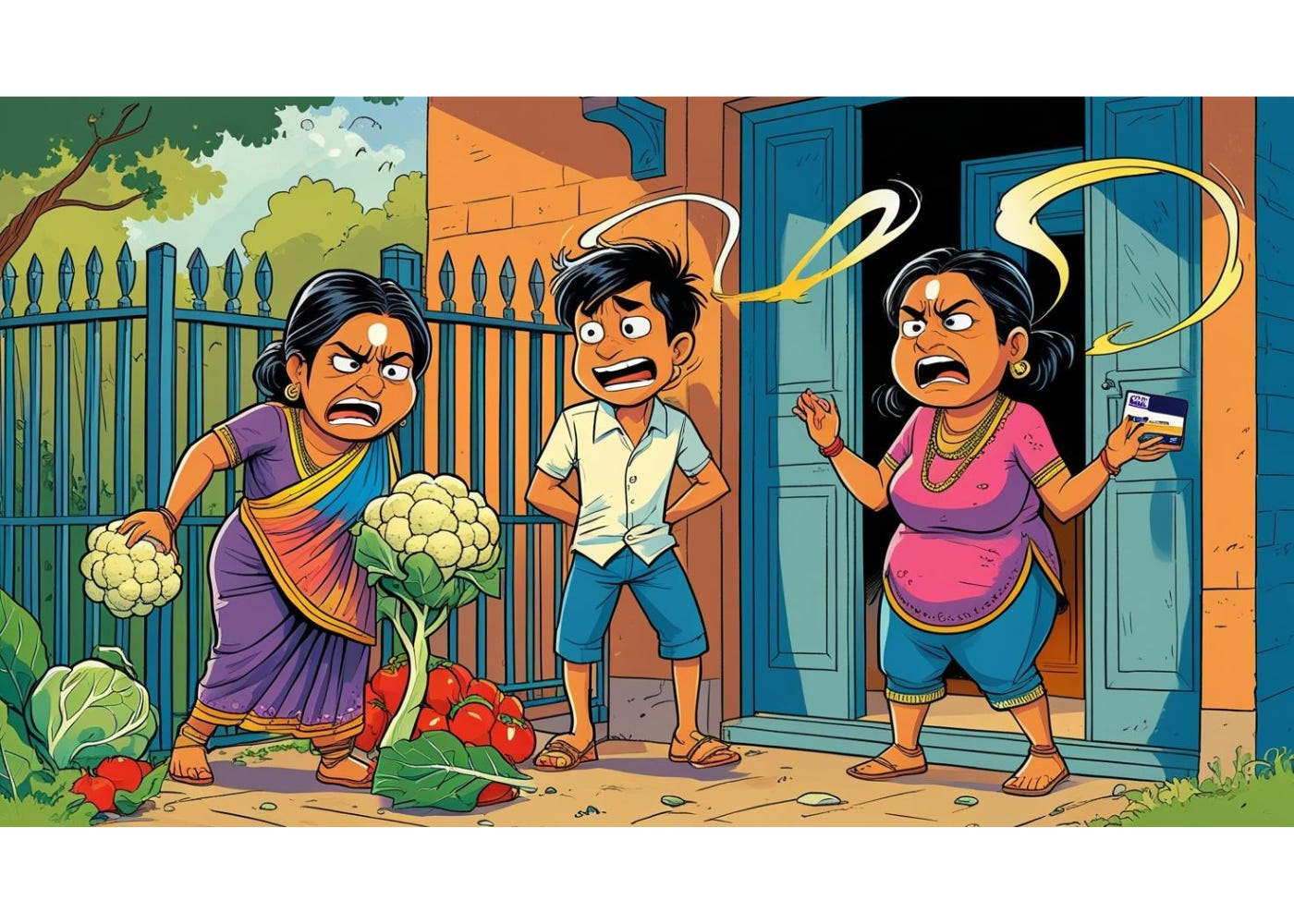 She was half-bent over the vegetable cart, a steel bowl in her hand, the smell of coriander mixing with the dust from the road. The vendor kept shouting, “Fresh tomatoes, ten rupees!” but even he had started watching our family drama like it was Netflix.